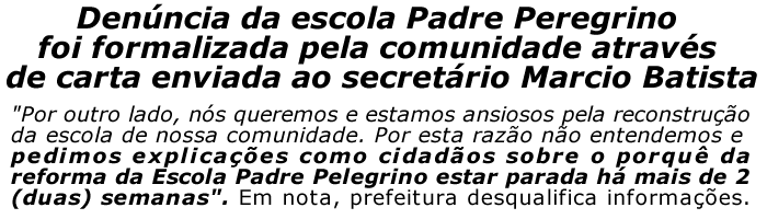 Por outro lado, nós queremos e estamos ansiosos pela reconstrução da escola de nossa comunidade. Por esta razão não entendemos e pedimos explicações como cidadãos sobre o porquê da reforma da Escola Padre Pelegrino estar parada há mais de 2 (duas) semanas. Inicialmente, nos foi divulgado que a previsão de entrega da Escola pela empreiteira seria até o dia 20 de outubro de 2011, fato complicado a contar da pausa de semanas no andamento das obras.
