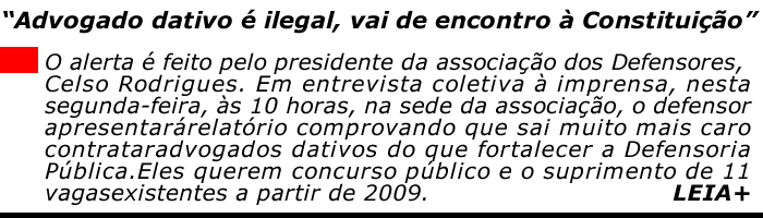 O alerta é feito pelo presidente da associação dos Defensores, Celso Rodrigues, em entrevista coletiva à imprensa, hoje às 10 horas, na sede da associação, o defensor apresentará relatório comprovando que sai muito mais caro contratar advogados dativos do que fortalecer a Defensoria Pública. Eles querem concurso público e o suprimento de 11 vagas existentes a partir de 2009.