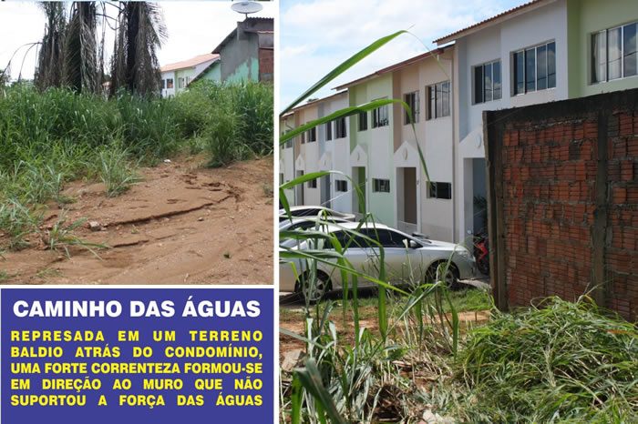 Uma forte correnteza formou-se em um terreno baldio que fica traz do condomínio, a força das águas foi tamanha que derrubou parte do muro e invadiu o residencial.