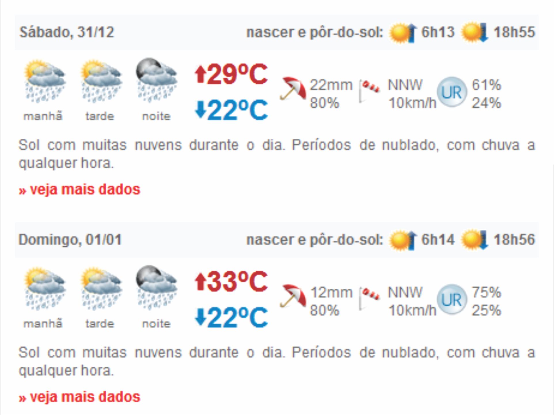 De acordo previsões do Clima Tempo, a noite de Réveillon –  sábado (31)  – em Rio Branco, capital do Acre, pode ser com chuva a qualquer hora,  a previsão de período nublado poderá atrapalhar a queima de fogos, mas nada que desanime o acriano que vai marcar a virada do ano  com o pagode do grupo Fundo de Quintal no estacionamento do Estádio de Futebol Arena da Floresta com Avenida Amadeo Barbosa.