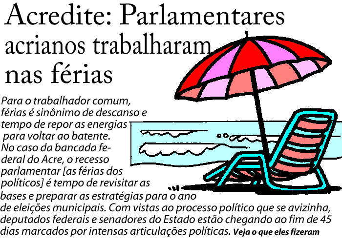 Para o trabalhador comum, férias é sinônimo de descanso e tempo de repor as energias para voltar ao batente. No caso da bancada federal do Acre, o recesso parlamentar [as férias dos políticos] é tempo de revisitar as bases e preparar as estratégias para o ano de eleições municipais. Com vistas ao processo político que se avizinha, deputados federais e senadores do Estado estão chegando ao fim de 45 dias marcados por intensas articulações políticas.