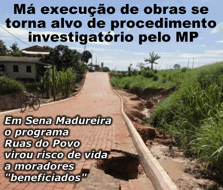 Em Sena Madureira a senhora Antônia Bernardo da Silva vem sofrendo após a execução do programa Ruas do Povo. Com a elevação da base para o recebimento da pavimentação com tijolos, seu terreno e os terrenos vizinhos passaram a ficar completamente alagados após as chuvas intensas do inverno amazônico.