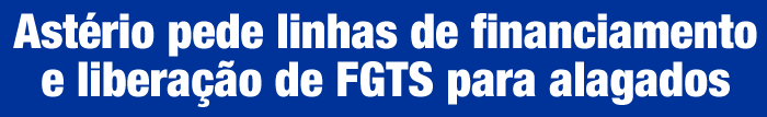 O deputado Astério Moreira (PRP) disse que vai sugerir ao governo do Estado que viabilize créditos com linhas de financiamento para que comerciantes, empresários e todos os que foram atingidos pela alagação reconstruam suas vidas. Segundo ele, como vem ocorrendo em outras áreas do Brasil onde ocorrem tragédias, o FGTS também pode ser liberado para que trabalhadores também possam reerguer suas vidas.