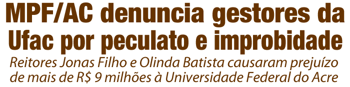 O Ministério Público Federal no Acre (MPF/AC) ajuizou uma ação penal e uma ação de improbidade administrativa contra o ex-reitor da Universidade Federal do Acre (Ufac), Jonas Pereira de Souza Filho, a atual reitora Olinda Batista Assmar, além da servidora Rosemir de Andrade Lima, por terem determinado e executado incorporações ilegais de quintos e décimos aos salários de servidores da Ufac, ilegalidade que beneficiou inclusive aos próprios gestores.