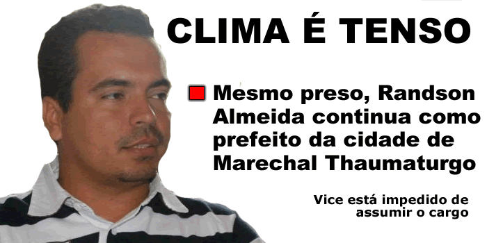 Mesmo preso, o prefeito Randson Almeida [PMDB] continua como gestor do município de Marechal Thaumaturgo. O clima é tenso na sede do município, localizado em uma das regiões mais isoladas do Juruá. Com a prisão na madrugada de domingo, feita pela Policia Federal, não houve a transmissão de cargo exigida pela Lei Orgânica do município. Com isso, o prefeito Praxedes, do PSDB, não foi empossado. Por telefone ele informou que não está despachando como prefeito em exercício.