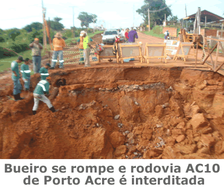 A AC-10, rodovia que liga Rio Branco a Porto Acre foi totalmente interditada logo após a Aseel (Associação dos Empregados da Eletronorte), devido o rompimento de um bueiro ocasionado pelas chuvas desta sexta-feira.