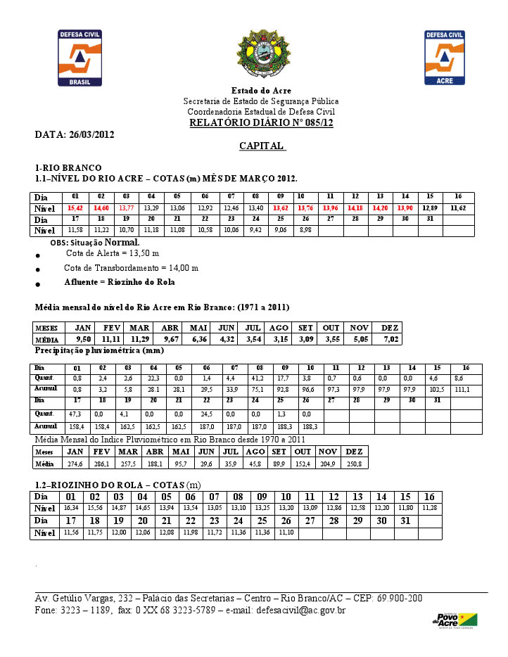 No interior do Estado por onde o rio Acre passa, como Brasiléia por exemplo, o rio que chegou a marca no mês passado acima de 12m, agora está com somente 3m60 em sua calha mais profunda. Confira os gráficos da Defesa Civil: