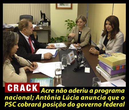 A deputada federal Antônia Lúcia (PSC-AC) vai trabalhar pela inclusão do Estado do Acre, no Plano Integrado de Enfrentamento ao Crack e outras Drogas, lançado pelo Governo Federal em 2010. De acordo com a parlamentar, o Estado ainda não teria assinado o convênio com a Secretaria Nacional de Políticas Publicas sobre Drogas (SENAD).