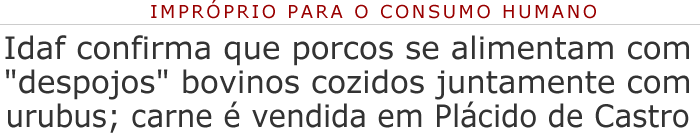 Ainda de acordo as informações, a criação de suínos será fiscalizada pelo Ministério Público. Há suspeita de que a carne também vem sendo consumida pela população de Plácido de Castro. A promotoria considera ser prática abusiva a colocação, no mercado de consumo, de qualquer produto ou serviço em desacordo com as normas expedidas pelos órgãos oficiais competentes (art. 39, VIII, do CDC).
