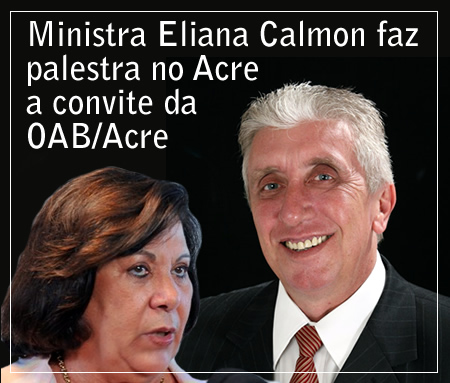 A ministra Eliana Calmon, do Superior Tribunal de Justiça (STJ) e corregedora-geral do Conselho Nacional de Justiça (CNJ) estará em Rio Branco na próxima semana, no dia 14, como convidada da Seccional Ordem dos Advogados do Brasil Seccional Acre. Ela fará palestra às 19 horas, no auditório da OAB sobre “Justiça e Precatórios” e já tem a presença confirmada de juízes, promotores, delegados de Polícia Federal, advogados e estudantes.