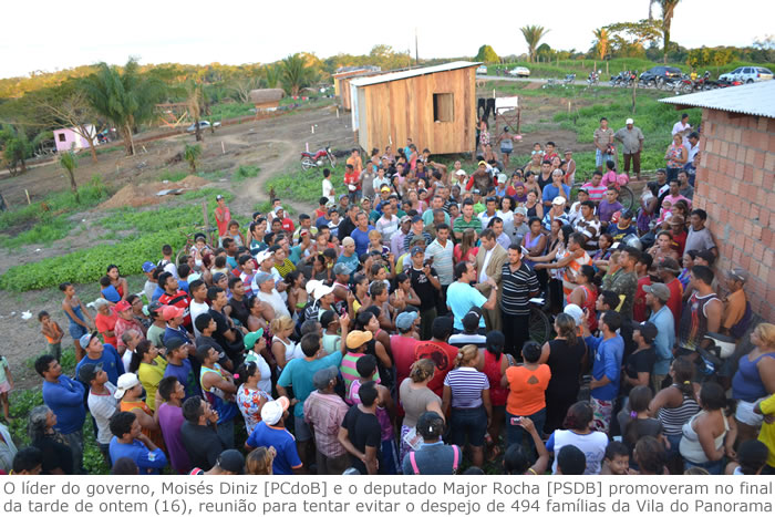 O líder do governo, Moisés Diniz [PCdoB] e o deputado Major Rocha [PSDB] promoveram no final da tarde de ontem (16), uma reunião para tentar evitar o despejo de 494 famílias posseiras da chamada Vila do Panorama, na região do São Francisco. Os deputados ajudaram a escolher uma comissão de representantes dos posseiros que às 9 horas de hoje (17), buscam apoio jurídico na Defensoria Pública, na tentativa de suspender a liminar expedida pelo juiz Gilberto Matos de Araújo, no dia 12 de maio, que decidiu após a realização da inspeção judicial juntada aos autos (fl. 175/188), pelo acolhimento do pedido de liminar de reintegração de posse. Além da agenda na defensoria, os deputados farão com a Comissão, uma visita ao presidente do Tribunal de Justiça do Acre.