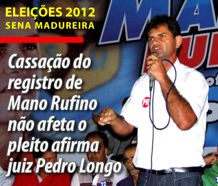“A cassação do registro de candidatura não interfere no pleito eleitoral de Sena Madureira. Até porque seria inviável fazer alteração na programação das urnas”, disse o juiz Pedro Longo, sobre a decisão da juíza eleitoral Zenice Mota, que cassou por crime de corrupção eleitoral, a candidatura de Mano Rufino (PR) à Prefeitura do município.