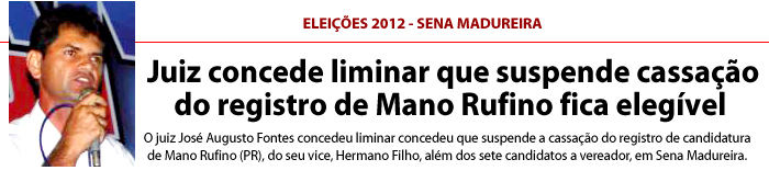 O juiz José Augusto Fontes concedeu liminar concedeu que suspende a cassação do registro de candidatura de Mano Rufino (PR), do seu vice, Hermano Filho, além dos sete candidatos a vereador, em Sena Madureira.