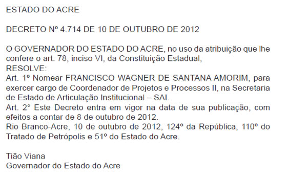 Mesmo após ter sido eleito mais uma vez prefeito de Rodrigues Alves, vencendo o atual prefeito Burica (PT), com o agravante de figurar entre os fichas-sujas do TCU, Francisco Wagner Santana de Amorim, o Deda, do PP, foi renomeado pelo governador Sebastião Viana, como Coordenador de Projetos e Processos II, na Secretaria de Estado de Articulação Institucional – SAI.