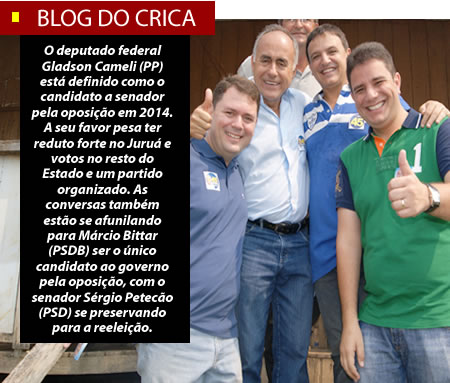 O deputado federal Gladson Cameli (PP) está definido como o candidato a senador pela oposição em 2014. A seu favor pesa ter reduto forte no Juruá e votos no resto do Estado e um partido organizado.