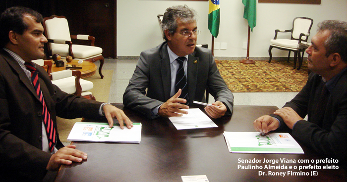 Dando continuidade às reuniões com os prefeitos eleitos do Acre, o senador Jorge Viana recebeu em seu gabinete os futuros administradores de Plácido de Castro, Dr. Roney, e de Bujari, Tonheiro. Nas reuniões, os prefeitos eleitos apresentaram projetos para diversas áreas prioritárias dos municípios e receberam do senador acreano o apoio para buscar os recursos necessários nas emendas parlamentares.