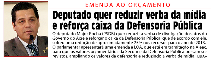 O deputado Major Rocha (PSDB) quer reduzir a verba de divulgação dos atos do Governo do Acre e reforçar o caixa da Defensoria Pública, que de acordo com ele, sofreu uma redução de aproximadamente 25% nos recursos para o ano de 2013.