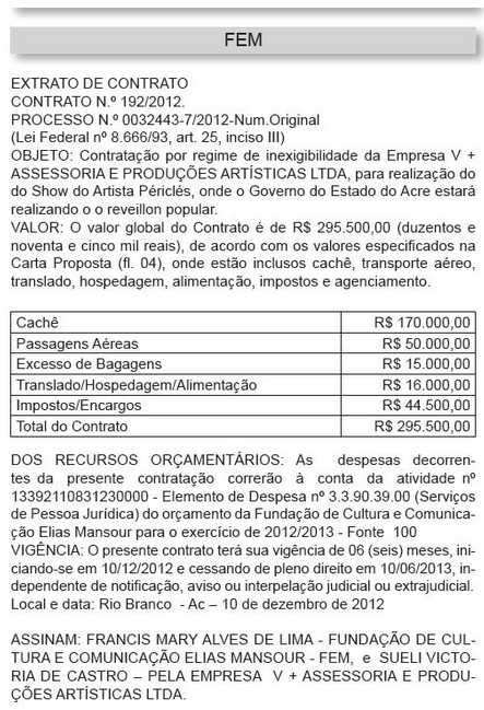 Para o contribuinte que estava achando caro o valor a ser pago pelo governador do Acre, Sebastião Viana, pela apresentação do pagodeiro Péricles ao custo de R$ 295.500,00, para animar a festa do Riveillon na virada do ano de 2012, a organização do evento não sairá por menos que R$ 402.909,44.