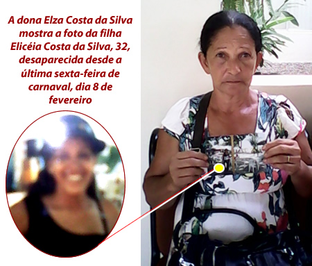 A dona de casa Elza Costa da Silva, 63 anos esteve na tarde deste sábado (16) na delegacia da 1ª Regional (Cadeia Velha) para registrar o desaparecimento de sua filha a diarista Elicéia Costa da Silva, 32, desaparecida desde a última sexta-feira de carnaval, dia 8 de fevereiro.
