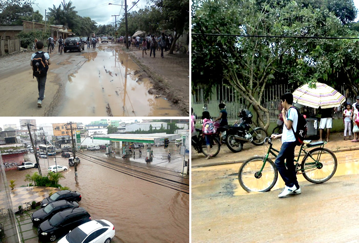 Os alunos da Escola Estadual Leôncio de Carvalho e da Escola Municipal do Benfica, localizadas na Vila Acre, no Segundo Distrito de Rio Branco, postaram fotos no facebook que mostram as águas inundando o asfalto do ramal Boa União por falta de escoamento. Barro e lama acumulados impedem a entrada nos portões de acesso levando os educandos a disputar espaços com os carros que circulam no local.