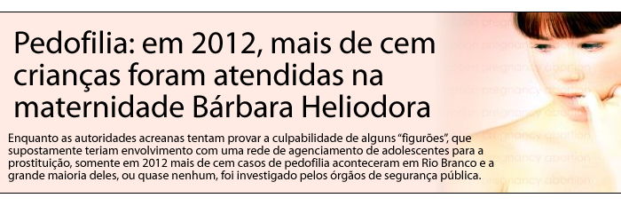Enquanto as autoridades acreanas tentam provar a culpabilidade de alguns “figurões”, que supostamente teriam envolvimento com uma rede de agenciamento de adolescentes para a prostituição, somente em 2012 mais de cem casos de pedofilia aconteceram em Rio Branco e a grande maioria deles, ou quase nenhum, foi investigado pelos órgãos de segurança pública.