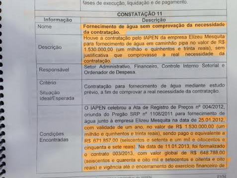 Mesmo tendo fornecimento de água confirmado pelo Depasa, “houve a contratação da empresa Elizeu Mesquita para fornecimento de água em caminhão pipa no valor de R$ 1,5 milhão – sem justificativa que comprovasse a rela necessidade da contratação”, afirma o relatório da CGE.