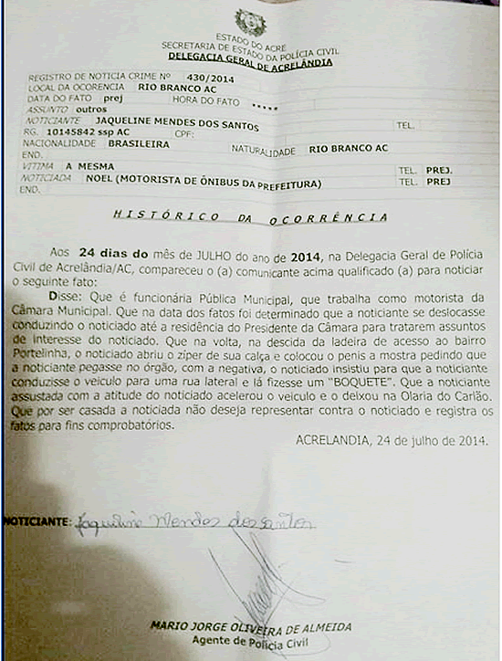 O fato foi denunciado na delegacia local pela J. M. S. Noel, que também é presidente de um sindicato local, não foi encontrado para dar sua versão. Na cidade de Acrelandia não se fala em outra coisa. O comentário nos quatro cantos da cidade é a tal tentativa frustada de um boquete.
