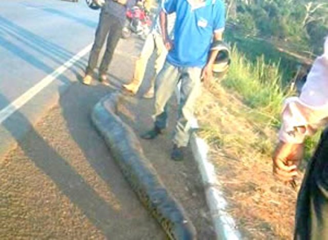 Uma cobra sucuri medindo aproximadamente 5 metros chamou a atenção dos internautas após ser encontrada e morta nas proximidades ao balneário Quinoá, sentido Rio Branco/Porto Velho, na BR – 364.