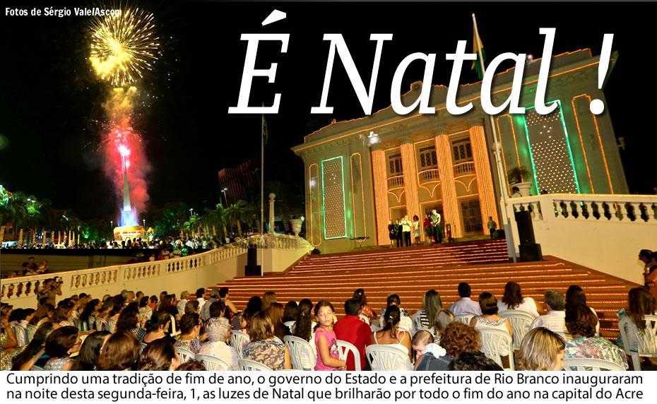 Cumprindo uma tradição de fim de ano, o governo do Estado e a prefeitura de Rio Branco inauguraram na noite desta segunda-feira, 1, as luzes de Natal que brilharão por todo o fim do ano na capital. Uma multidão se reuniu em frente ao Palácio Rio Branco para ver as luzes sendo acesas, numa grande festa apresentada pelo governador Sebastião Viana e a primeira-dama Marlúcia Cândida, que idealizou o projeto de iluminação natalina.