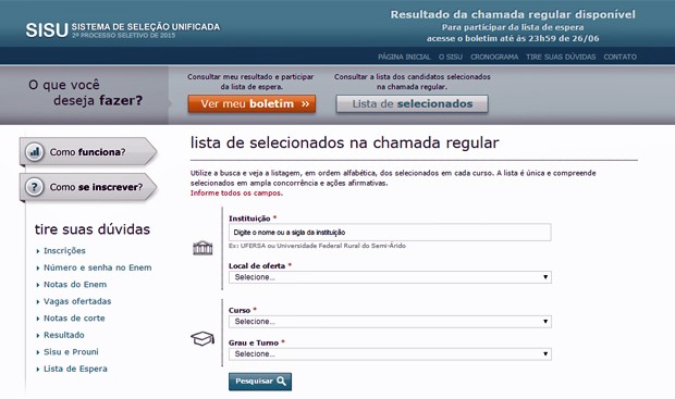No site do Sisu, é possível selecionar a instituição, o curso e a modalidade do turno para filtrar a lista de aprovados.