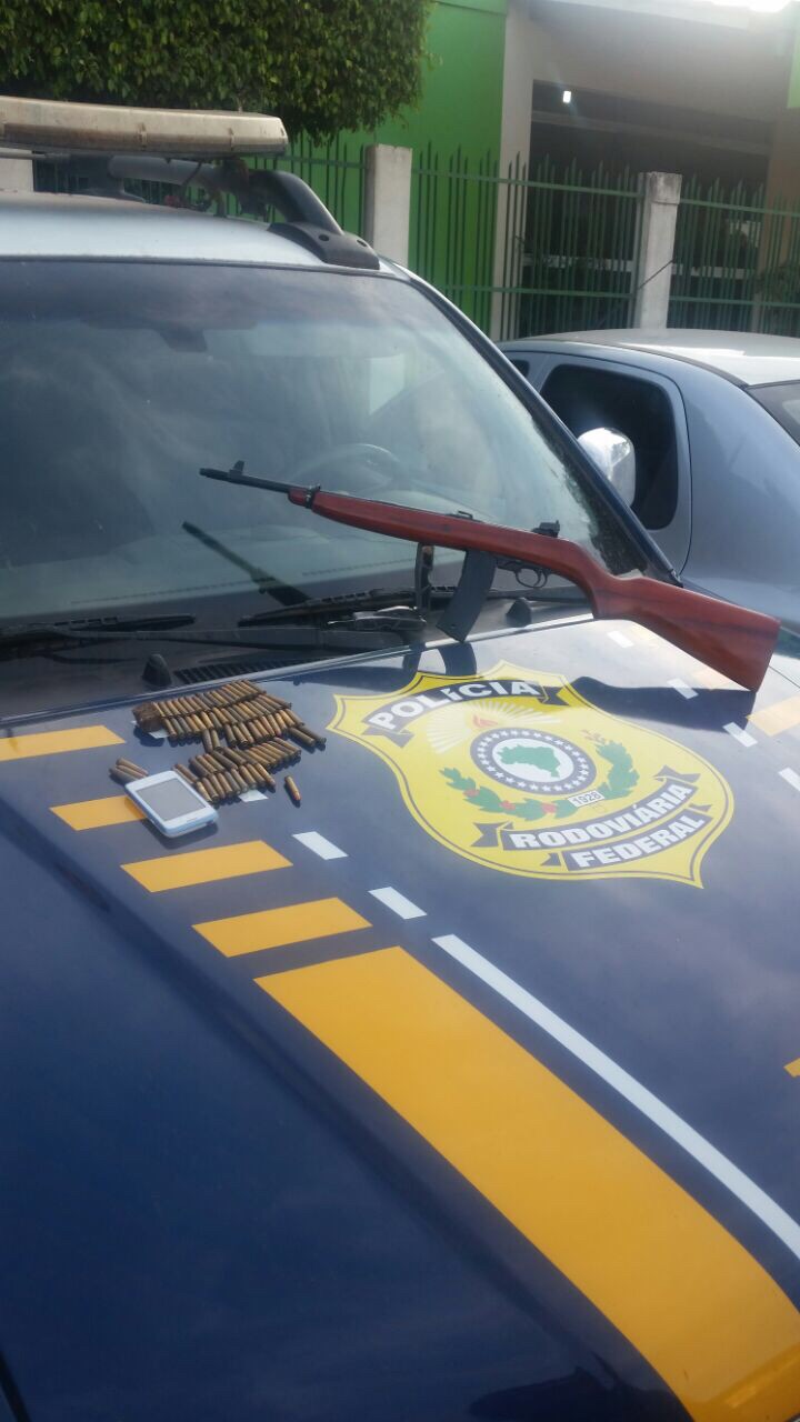 Em fiscalização de rotina na BR 317, Km 110, próximo a Senador Guiomard na tarde de ontem, uma equipe da Polícia Rodoviária Federal – PRF abordou um veículo táxi, que fazia o itinerário Brasiléia/AC – Rio Branco/AC, ocupado por 04 passageiros dos quais 03 estrangeiros (haitianos) e uma brasileira. A equipe da PRF solicitou que todos desembarcassem do veículo e identificassem seus pertences e malas que eram transportados no bagageiro do veículo. Em entrevista preliminar o comportamento da passageira chamou a atenção, pois ela demonstrava nervosismo e respostas desconexas a respeito da motivação de sua viagem. Ao realizar vistoria na mala de viagem previamente identificada pela passageira como sendo de sua propriedade, a equipe PRF encontrou, enrolada em roupas femininas, uma carabina marca US Carabine, um carregador vazio e 73 munições intactas.