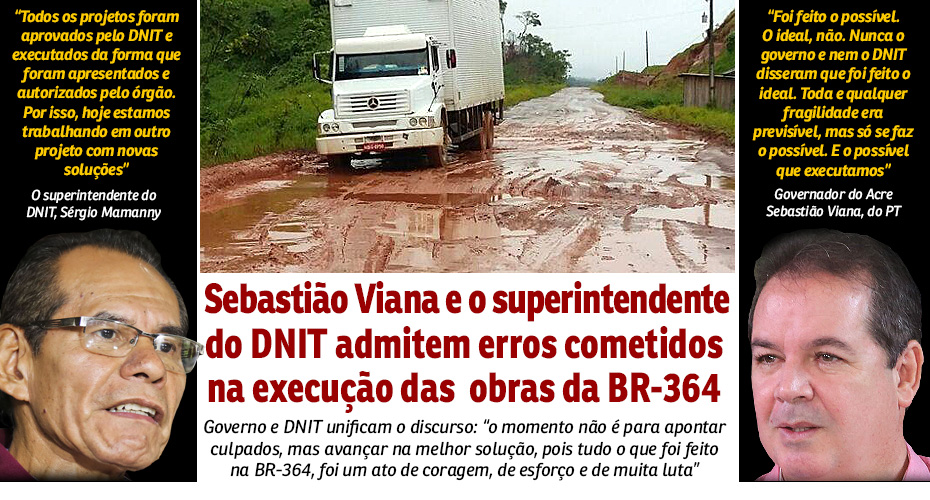 O governador Sebastião Viana (PT) e o superintendente do Departamento Nacional de Infraestrutura de Transportes (DNIT), o engenheiro Sérgio Mamanny, praticamente admitiram que foram cometidos erros no projeto de construção da BR-364. O encontro correu na manhã de terça-feira (19), alguns dias após o gestor do DNIT assegurar e divulgar uma nota informando que recebeu a rodovia em péssimas condições de tráfego das mãos do Estado.