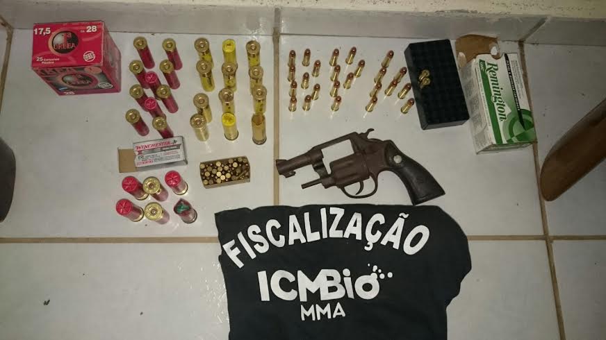 Em posse do senhor Manuel, também havia uma motoserra, quatro espingardas, sendo duas calibre 20, com dez munições uma calibre 28, uma carabina de pressão adaptada para o calibre 22 e também com dez munições, além de um revólver calibre 38, com vinte e seis munições.