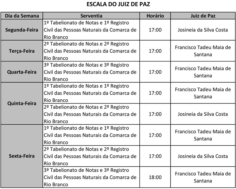A Corregedoria Geral da Justiça (Coger) determinou que os cartórios de Registro Civil das Pessoas Naturais da Comarca de Rio Branco celebrem casamentos civis em todos os dias úteis da semana.