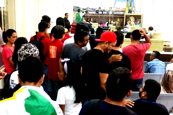 Integrantes de movimentos estudantis, do PT, PC do B e PHS tomam a galeria da Câmara de Vereadores na manhã desta quarta-feira, 15. Eles serão recebidos daqui a pouco no plenário da Casa pelos vereadores para um debate sobre a passagem de ônibus estudantil.