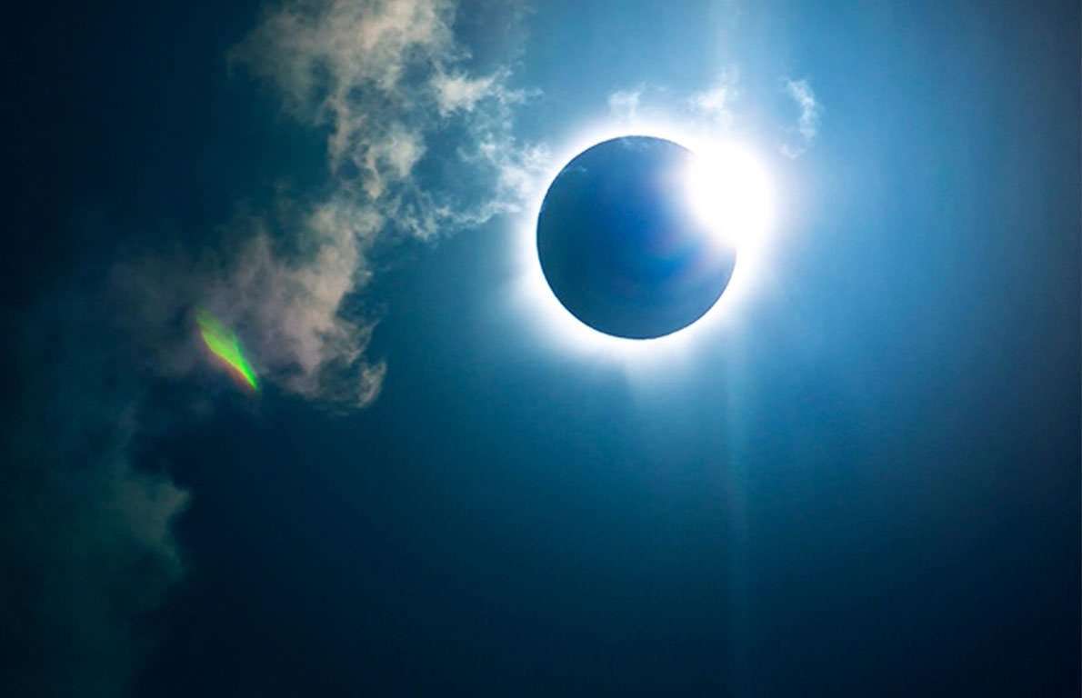 Esse tipo de eclipse acontece quando, para um observador na superfície terrestre, a Lua passa exatamente na frente do Sol bloqueando a luz de nossa estrela por alguns minutos. Esse tipo de eclipse é visível numa estreita faixa sobre a Terra, o que o torna raro para quem o vê. É no eclipse solar total que, instantes antes ou depois, pode-se ver o fenômeno chamado “anel de diamante”, o qual é um pequeno feixe de luz ainda a ser bloqueado pela Lua durante sua passagem na frente do Sol.