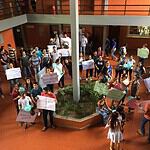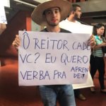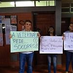 Em posse de cartaz, os estudantes denunciavam a falta de verba para compra de material para ministração de aulas práticas. Além disso, os estudantes denunciam precariedades nas salas de aula do bloco de Veterinária.