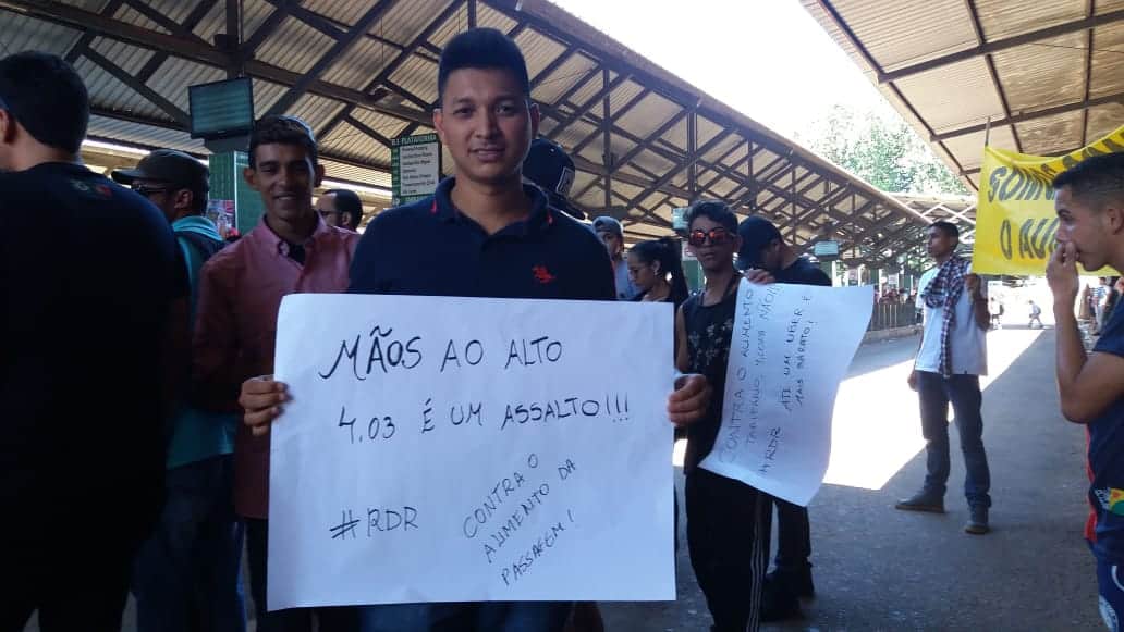 O pré-candidato a governador do Acre, Lyra Xapuri (PRTB), compareceu ao ato no Terminal Urbano de Rio Branco contra a passagem de ônibus na manhã desta segunda-feira, 21. Com um cartaz na mão, Xapuri, também conhecido como Locutor do Formigão, protestou. Ele também discursou em cima do caminhão de som.