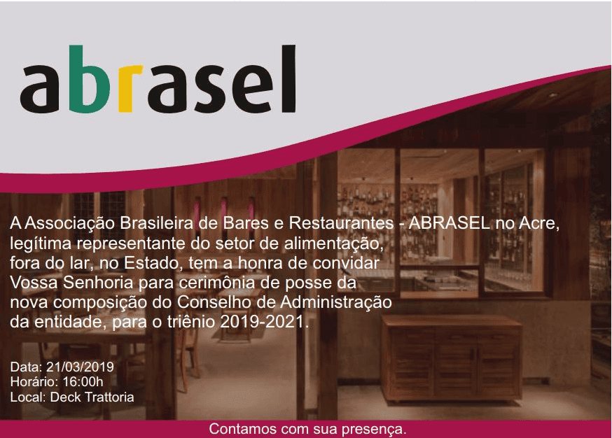 A Associação Brasileira de Bares e Restaurantes – ABRASEL no Acre, legítima representante do setor de alimentação, fora do lar, no Estado, anuncia a cerimônia de posse da nova composição do Conselho de Administração da entidade, para o triênio 2019-2021.