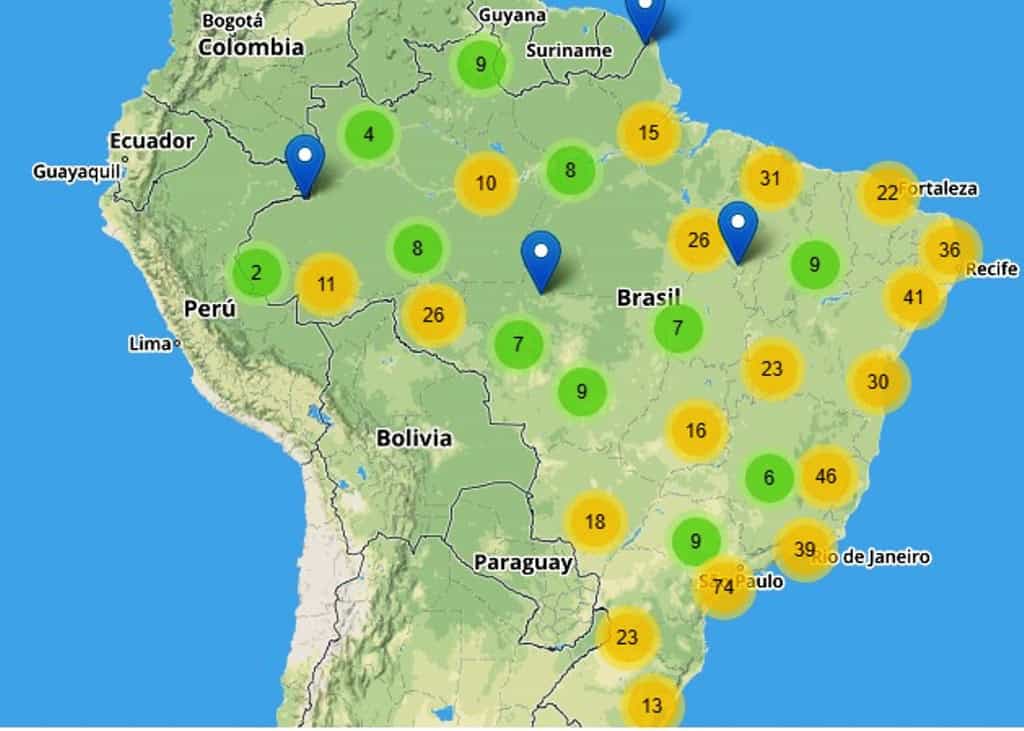 O mapa cita, por exemplo, que “21 anos depois da morte de Chico Mendes, extrativistas continuam tendo que lutar por seus direitos em Xapuri”, com uma marcação sobre o município de Xapuri.
