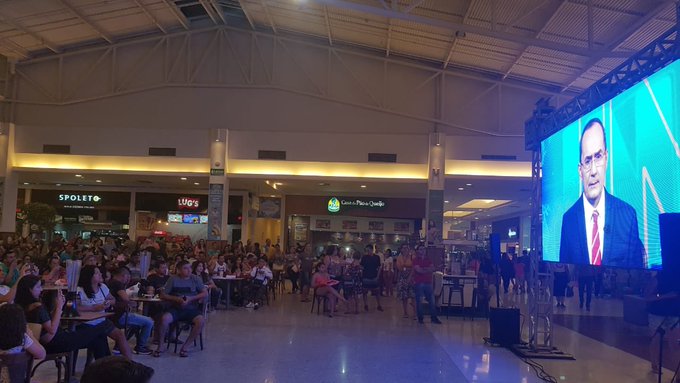 A transmissão já está rolando desde as 18:30 horas, o público está acompanhando ao vivo, na Praça de Alimentação.