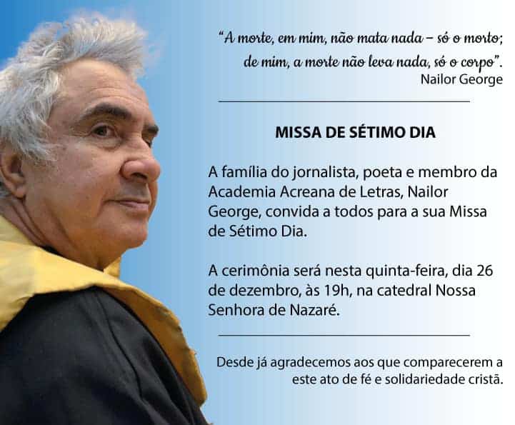 A Missa de Sétimo Dia do jornalista, poeta e membro da Academia Acreana de Letras, Nailor George, que foi sepultado na última semana, em Rio Branco, será realizada nesta quinta-feira, dia 26, às 19 horas, na Catedral Nossa Senhora de Nazaré, também na capital acreana.