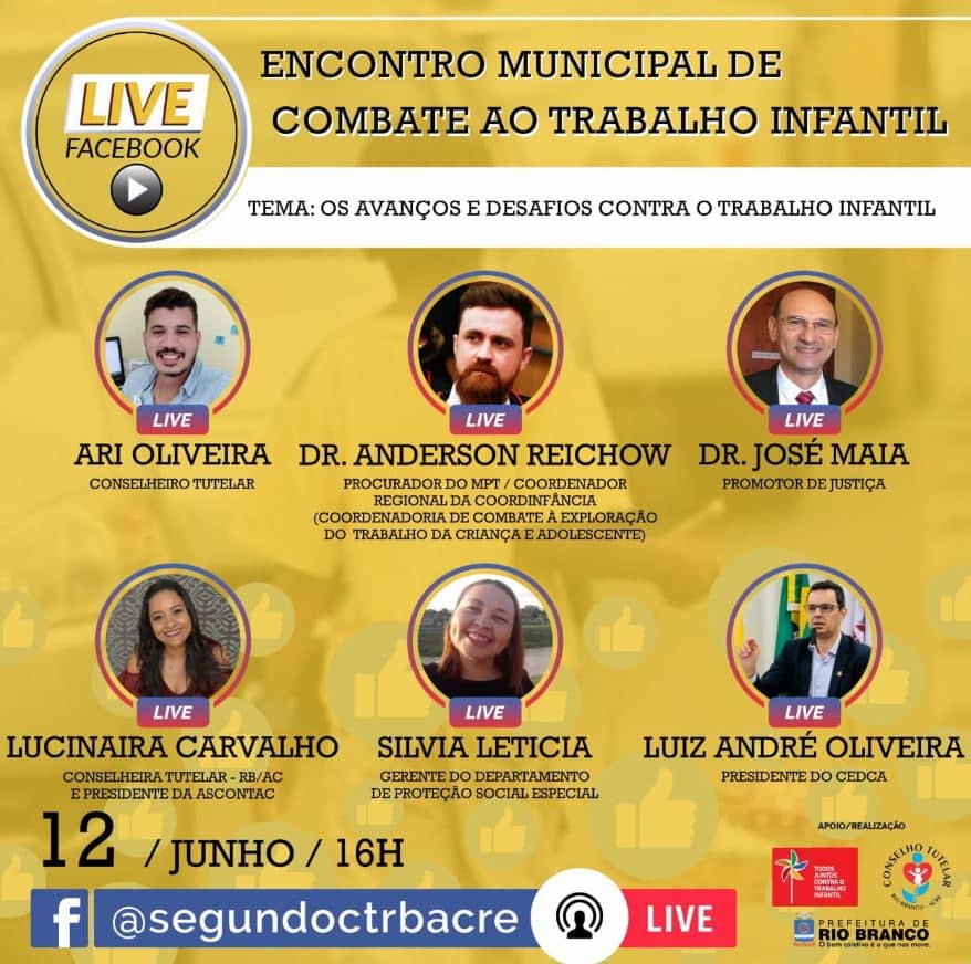 Em tempos de pandemia, o Segundo Conselho Tutelar de Rio Branco promove um encontro virtual para discutir o assunto com o tema “Os Avanços e Desafios Contra o Trabalho Infantil”.