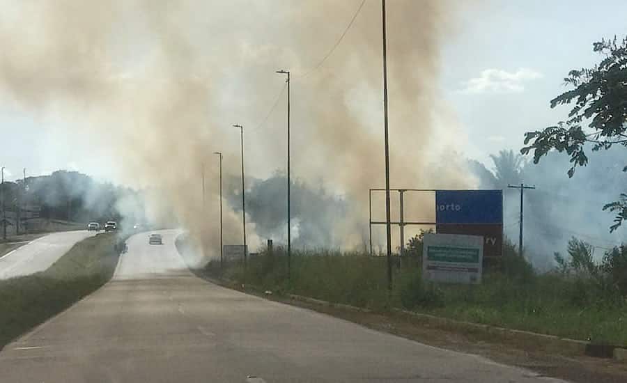 Queimada ilegal na estrada do aeroporto atinge garagem de ônibus
