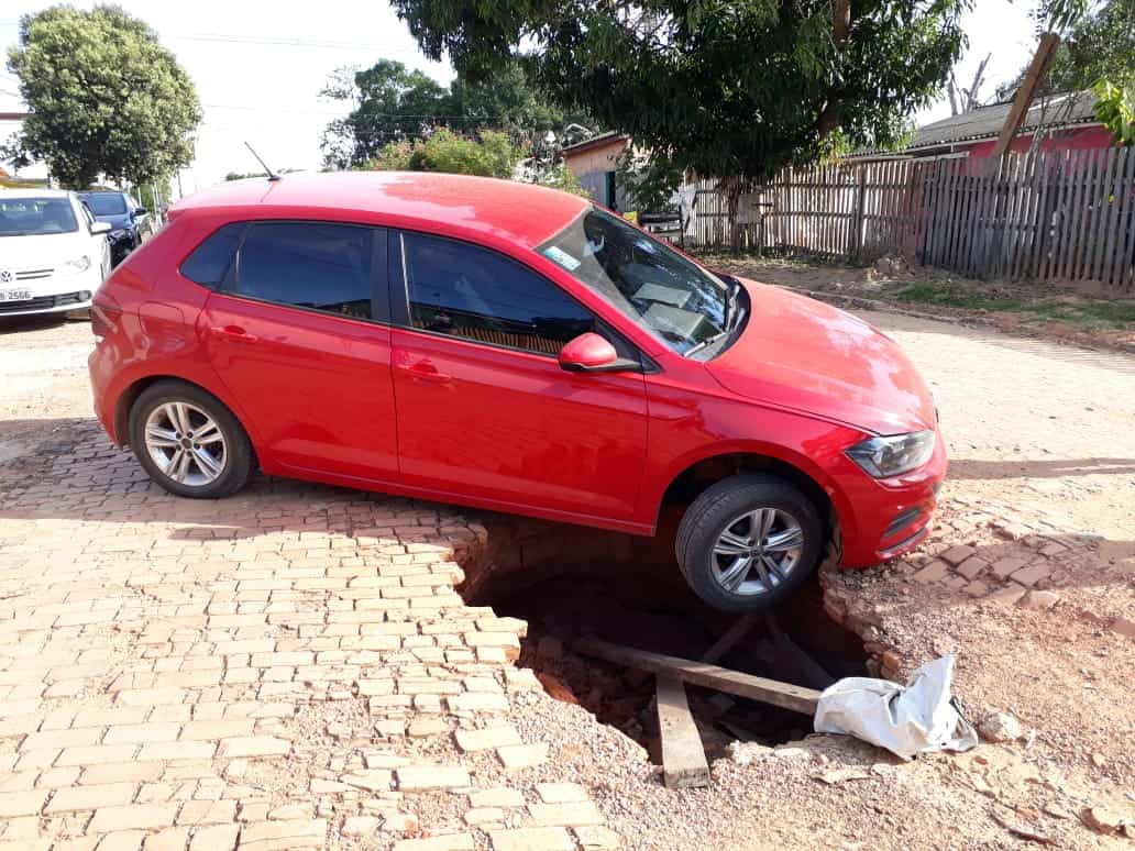 Um veículo Volkswagen Fox quase foi tragado por um grande buraco que se abriu em um bueiro que passa sob a rua Pio Nazário, região central de Xapuri, na tarde desta segunda-feira (21).