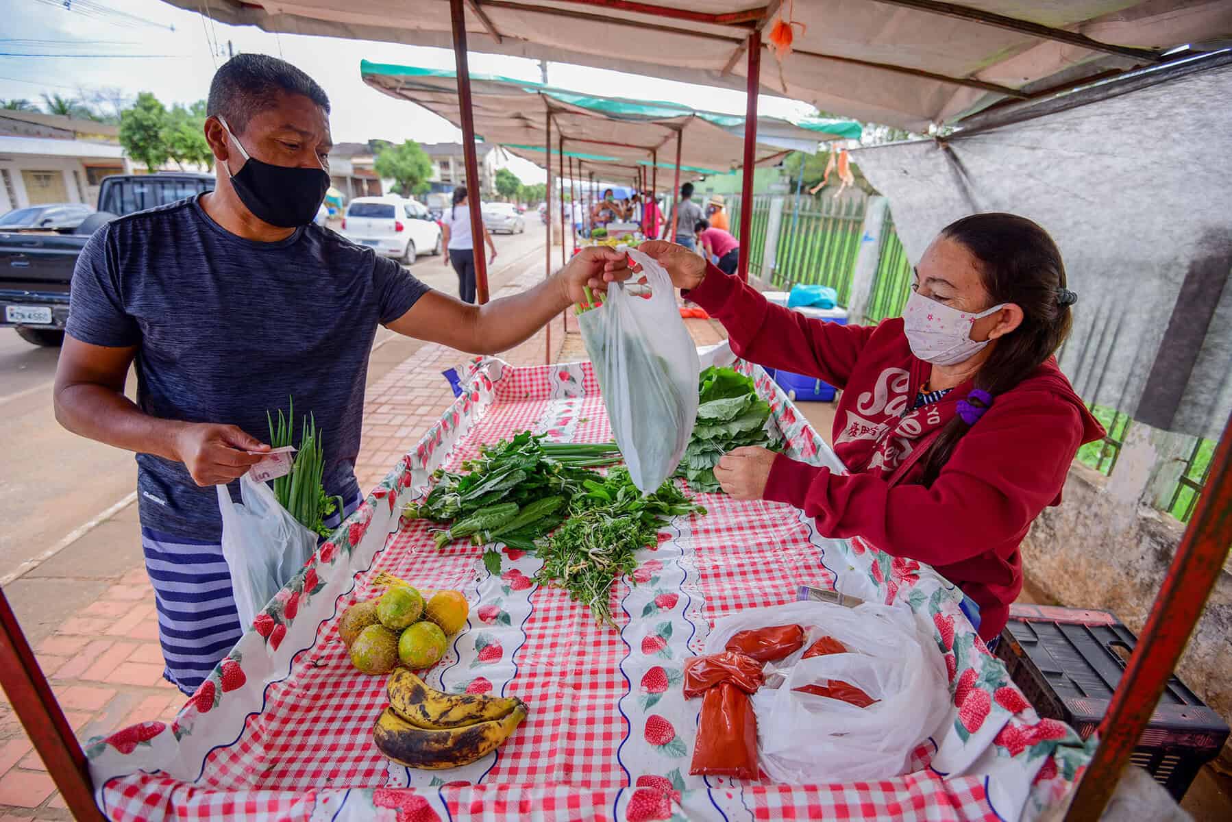 Na Rodovia AC-10, que dá acesso ao bairro Adalberto Sena e outros, em Rio Branco, o domingo, 26, foi de alegria para parte dos produtores do Polo Agroflorestal Geraldo Fleming. É que depois de quatro meses sem poder comercializar os seus produtos, ao ar livre, eles retomaram às atividades. “Estava sendo difícil pra gente. Para não perdermos as vendas totalmente, pegamos o contato dos clientes e ficamos entregando pela metade do preço. Não era o ideal, mas pelo menos nos garantiu alguma coisa por esse tempo”, contou a produtora Liliana Guimarães.