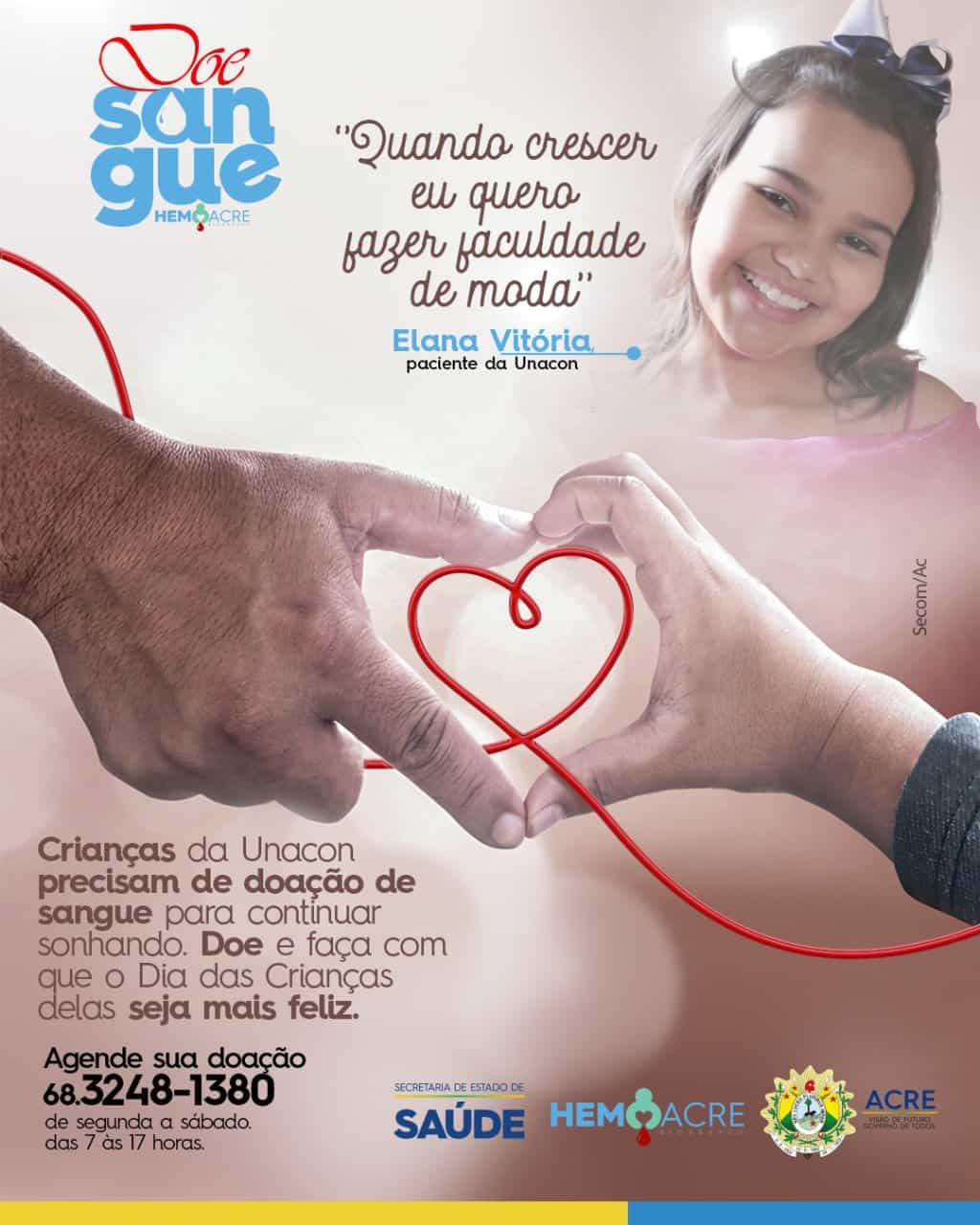 Que tal um dia das crianças marcado pela solidariedade? Essa é a proposta da Secretaria Estadual de Saúde (Sesacre) para incentivar às pessoas serem doadoras de sangue para as crianças que fazem tratamento contra o câncer na Unidade de Oncologia do Acre (Unacon).