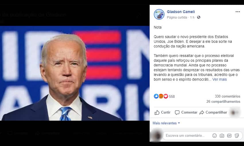 Gladson defendeu a legitimidade do processo eleitoral dos EUA criticando o desprezo de alguns pela democracia. “Ainda que no processo estejam tentando desprezar os resultados das urnas levando a questão para os tribunais, acredito que o bom senso e o espírito democrático prevalecerão”, disse o governador acreano.