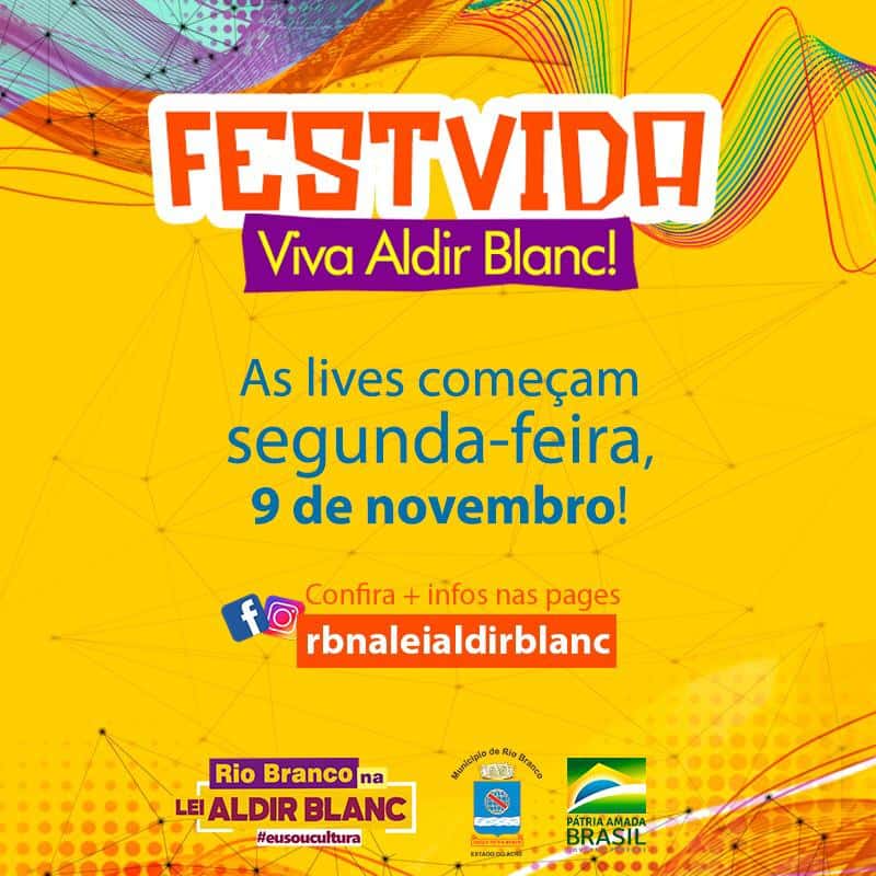 O FestVida – Viva Aldir Blanc começa nesta segunda-feira e vai até 30 de novembro, incluindo os finais de semana. O evento será realizado totalmente pela internet, sendo que a programação vai contar com apresentações de 152 artistas, com duração de no mínimo 50 minutos e máximo de 120 minutos. As lives também deverão ser simultâneas ou exclusivamente nas plataformas Youtube e Facebook.
