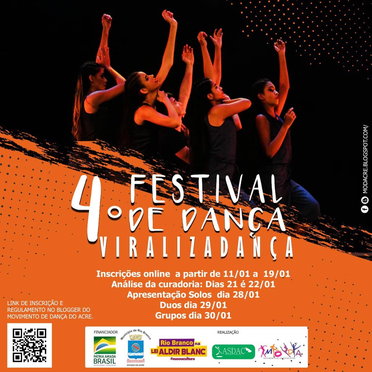 O Festival de Dança de Rio Branco ocorre de 28 ao dia 30 deste mês e será transmitido em tempo real pela internet, a partir das 19h, na página do Movimento de Dança do Acre (Moda) no Facebook e também pelo YouTube.